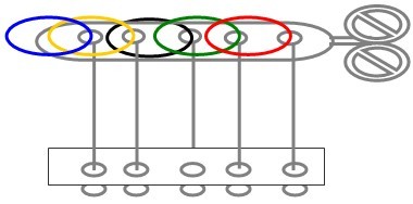 五连环的结构如图。其基本要素是五个带连杆的环、带框的环柄和有五个洞眼的底板,它们之间相互联系、相互作用、相互依赖和相互制约,形成了一个不可分割的整体。在《系统的结构》的学习的第二、三课时,在学习了构成系统的条件和系统的基本特性后,安排两次五连环的组装,第一次作为试验和学习,为自己制作一个试验器材,第二次作为呈现给奥运的礼品,同时巩固对系统的结构、构成系统的条件和系统的基本特性的认识。